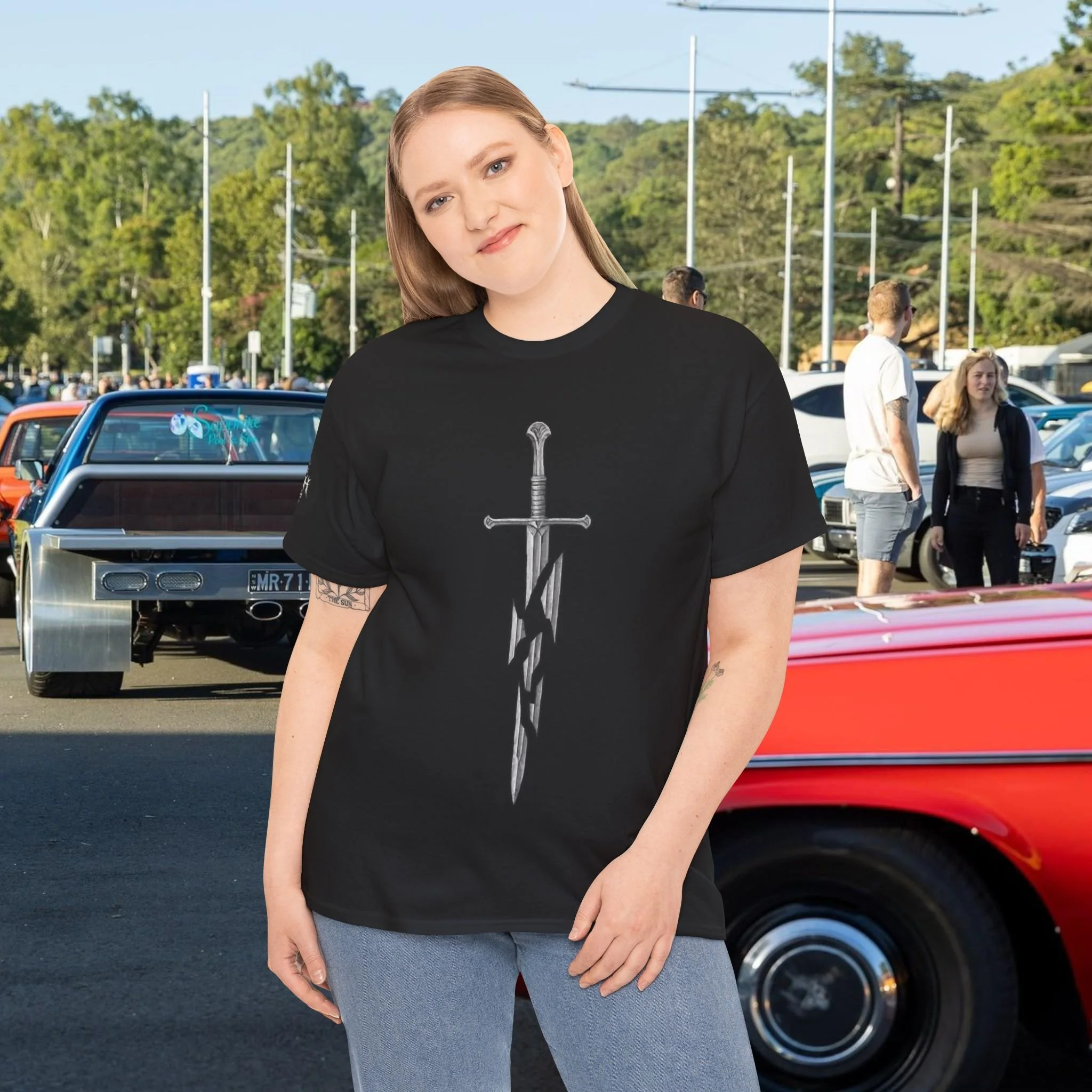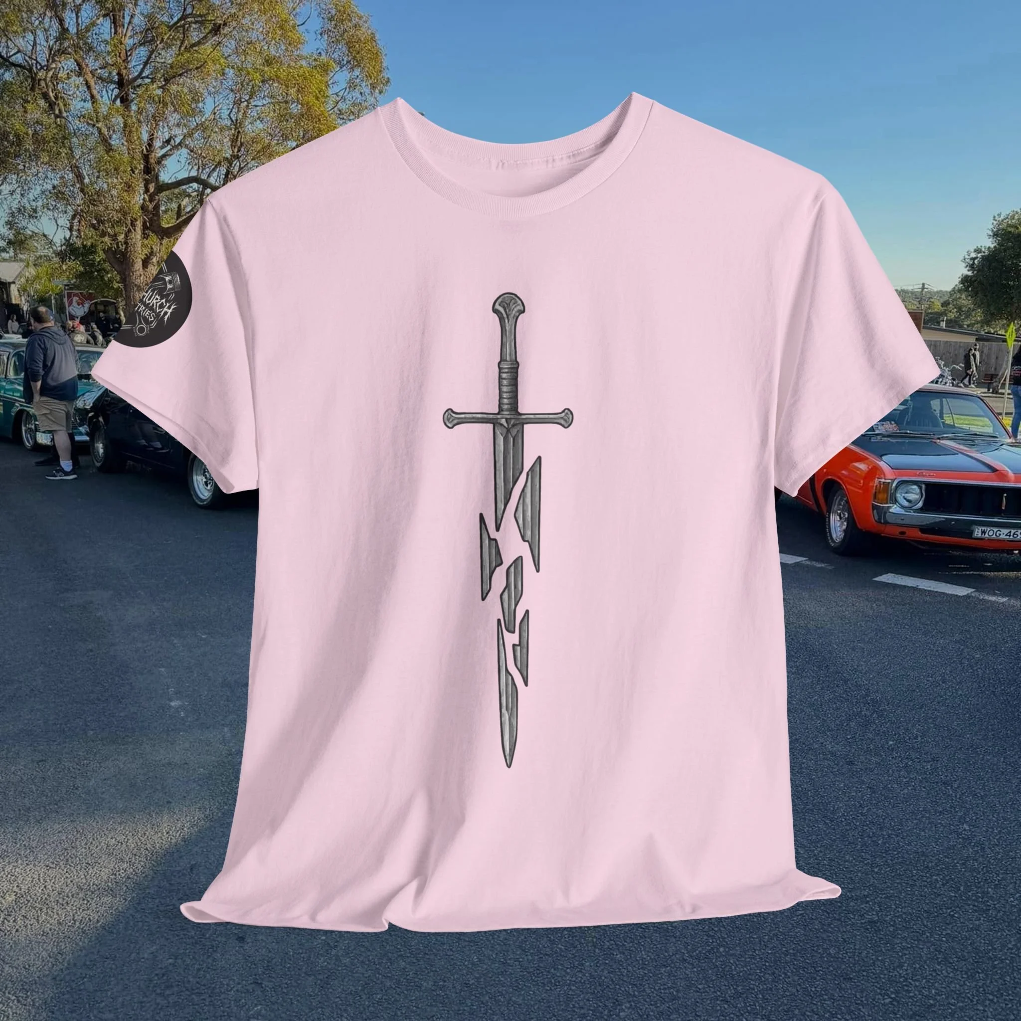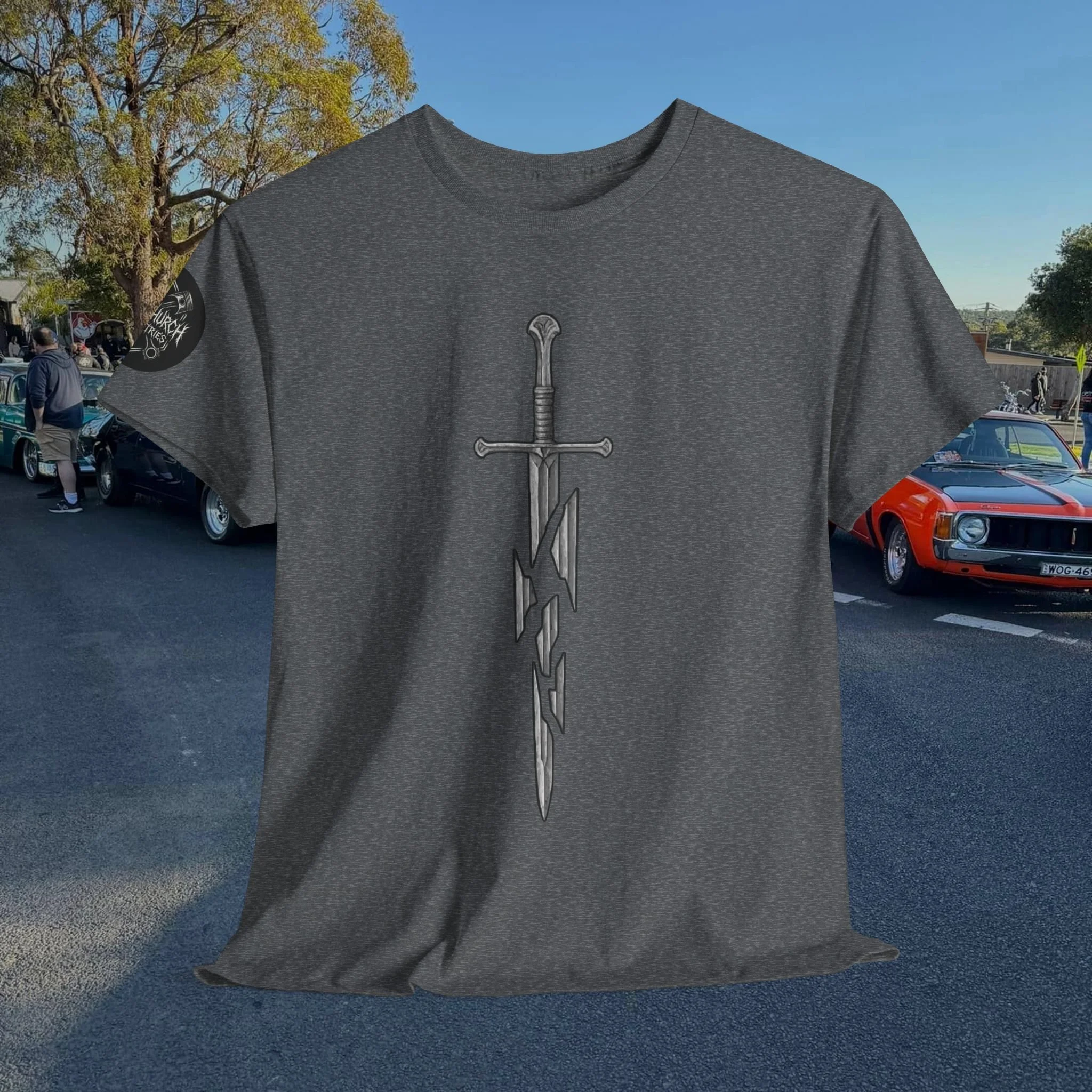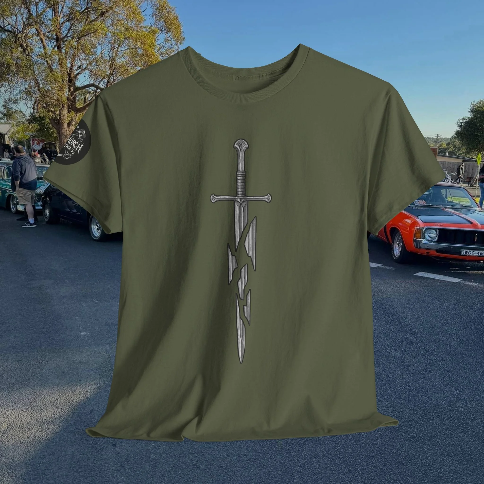 Step into a fusion of classic fantasy and car culture with our Car Church Industries Andúril T-Shirt. Available in multiple colors like Military Green, Black, and more, this shirt features a stylish graphic of the iconic Andúril sword. It’s a perfect blend of your love for epic quests and the laid-back vibe of the automotive scene.
