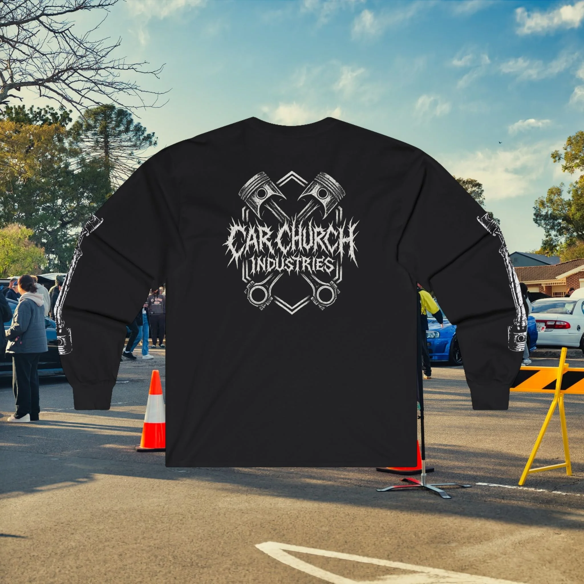 Heavyweight long sleeve tee featuring Car Church Industries artwork front and back.